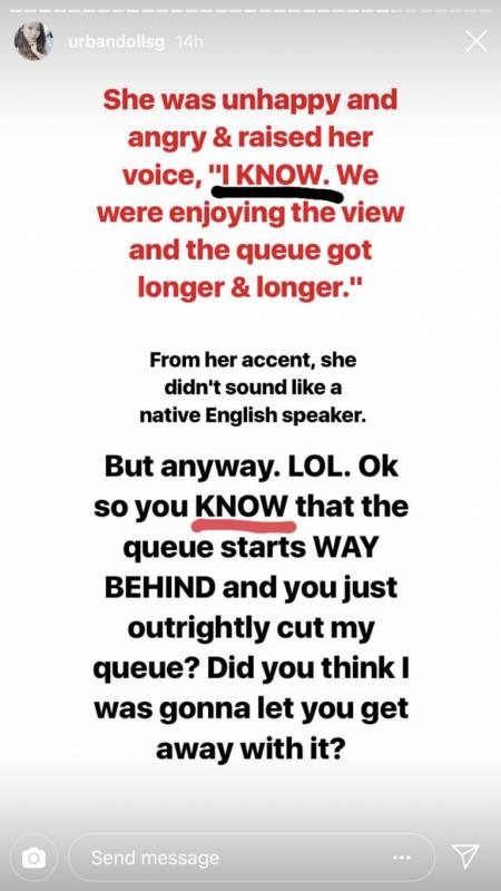 Woo真是气死了,她在ins上抱怨道:“Excuse me?您知道队伍在后面,但您就从我这里直接插进来了?大家都在欣赏景色,但谁都知道,要从队伍末尾开始排队吧?谁给您的权利觉得插队是正确的?
