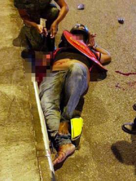 照片也显示,一名相信是摩哆骑士的男子躺在路旁,身体及四周的马路也可见斑斑血迹。
