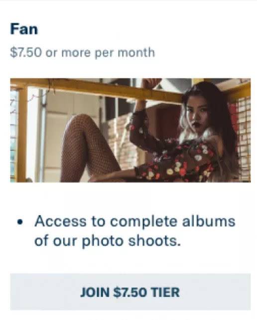 初级粉丝,每月7.5美元。能在官网平台上看尽览图片;