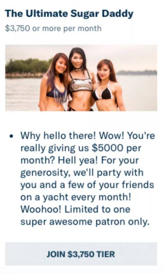 极品“糖爹”,每月3750美元。举办私人游艇美女派对,每月只有出价最高的极品“糖爹”能获得该机会。