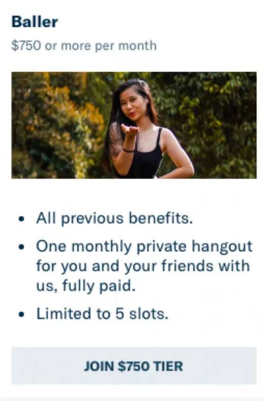 高富帅,每月750美元。为会员和他朋友提供该平台全额付费私人聚会,最多邀请5人;