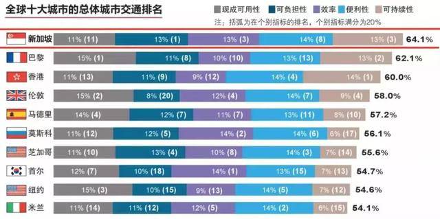 最近麦肯锡发布了《全球24个城市交通系统的成功要素》报告,在入榜的十大城市的总体城市交通排名中,新加坡以64.1%的最高总得分名列榜首,领先巴黎、香港、伦敦等城市。