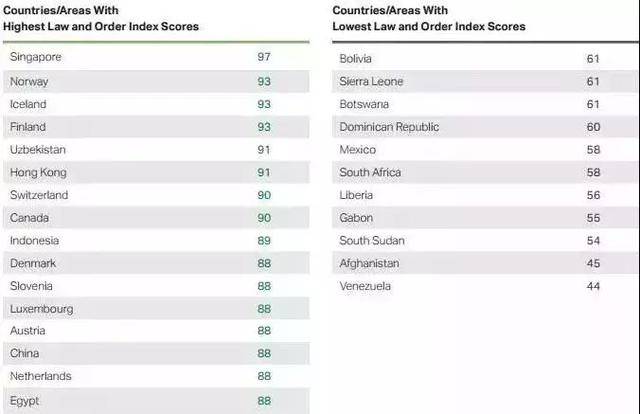 近期美国民意调查公司盖洛普公布了2018年《全球法律与秩序报告》。该报告根据全球142个国家和地区的居民反馈,基于居民自身的安全感,对全球各地进行了法律与秩序指数排名,得分越高,说明安全系数越高。