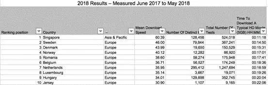 今年英国 Cable.co.uk 网站公布全球 200 个国家宽带网络下载速度排名榜,新加坡以平均下载速度为 60.39 Mbps 的网速夺得冠军,相当于下载一部 5GB 的高清电影仅需要 11 分钟,这网速太给力了!