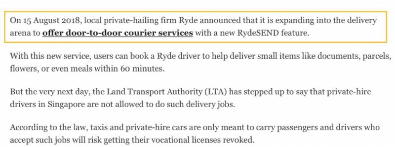 私召车业者Ryde,2018年8月份宣布,推出名为RydeSEND的快递服务,让司机能在非繁忙时段通过送货赚取更多收入。不过新加坡陆路交通管理局发出警告,指服务触犯条例。
