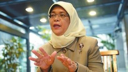 新加坡马来族女总统哈莉玛兴致勃勃地挥毫书写了汉字“吉”。