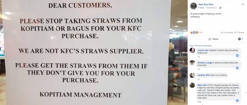 网络流传一张告示的照片,告示内容呼吁顾客不要在买了知名快餐连锁店肯德基(KFC)的食物后,向Kopitiam和Bagus食阁领取吸管。