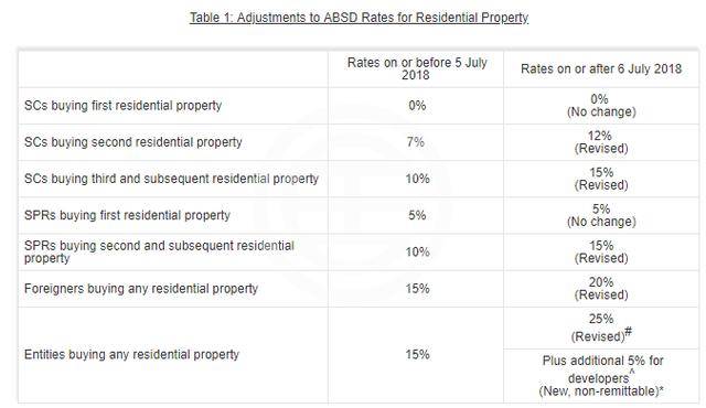 此前,新加坡公民购买首套房时免除印花税,但在购买第二丶第三套及更多套私宅房子,分别需付额外7%和10%印花税;对于永久居民,购买第一丶第二及更多套房子,分别需付额外5%和10%印花税;外国人和实体购买房子时,一律需付额外15%印花税。