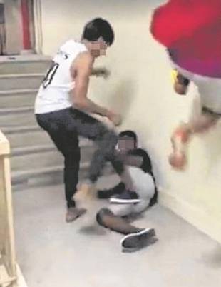 被打的少年一下成了人肉沙包,更令人发指的是当上一波拳打脚踢还未休止,就有男生一个助跑,大步跃起,狠狠的踩到少年头上……