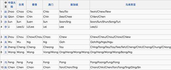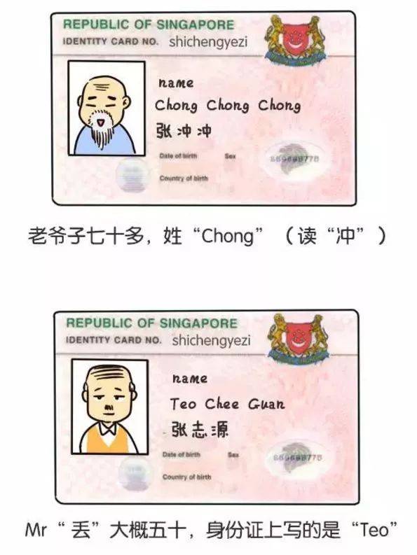 栗子3:读大学的时候,有一个新加坡籍的讲师介绍自己时在白板上写了Macus Teo, 对应的中文是“张”。 这位先生家里老中青爷孙三代明明都姓张,身份证上注册的姓氏竟然都不一样,分别是 Mr Chong(老师爸爸))、Mr Teo(老师自己) 和 Mr Zhang(老师儿子) 。不要说我那些澳洲同学打死不相信他们是爷孙三,连我这个受中华文化熏陶长大的“五百年前的家人”也只得学人摆手耸肩了。