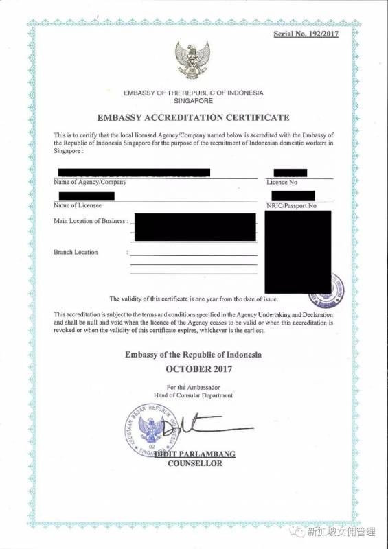 新加坡劳工部并不要求女佣中介一定要拿到印尼或者菲律宾的劳务中介认证。但是,印尼菲律宾希望新加坡中介能够在大使馆申请劳务中介认证,在除了满足劳工部的要求外,也会帮助使馆保护女佣的薪水,休假和人身安全。
