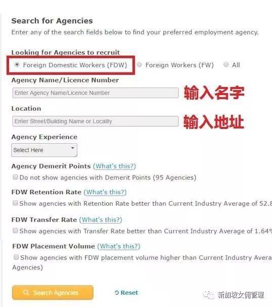网页界面简单明了,先要选择红框里的FDW以确保选的都是女佣中介。然后就可以输入中介的名字或者你家附近的地址来看有哪些中介可以拜访。屏幕显示的中介信息如下,有几个指标需要注意。