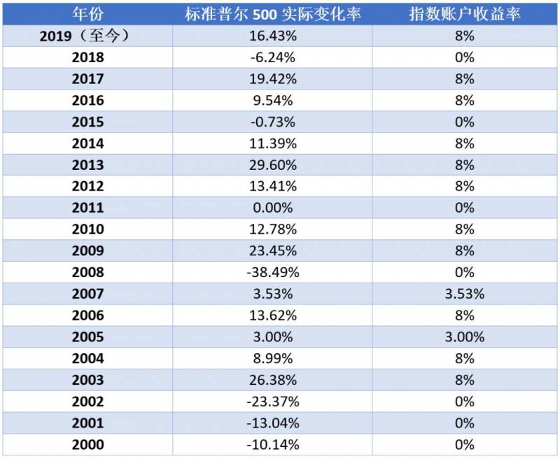 需要注意的是,“指数增值账户”中的资金并不完完全全追踪对应的指数,而是设有最低和最高派息率。其中最低派息率为0%,所以即便遇到经济危机,保单价值也不会受到巨大的负面影响。反过来,新加坡IUL对应标普和恒生设定的最高派息率分别是8%和9.5%,也就是说如果某年股市表现特别好,保单也只能依据最高上限来派息。