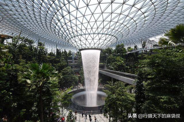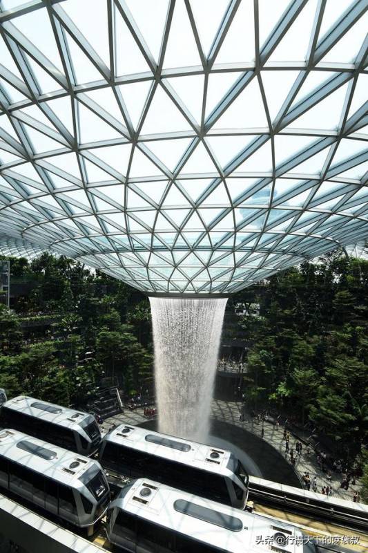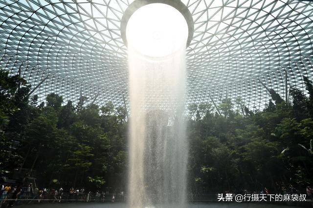 这个世界最高的室内瀑布达40 米高,从建筑的圆顶上倾泻下来,贯穿了建筑的多个楼层。据说为了适应新加坡多雨的天气,落入室外喷泉的雨水将以每分钟 1 万加仑(约 37854 升)的速度泵入瀑布,并在之后用于灌溉周围植物和机场建筑服务上。
