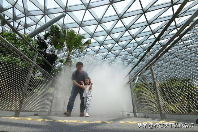一段长度并不长的玻璃桥让你体验一把高空领略瀑布和整个屋顶花园。只是走这座桥需要门票$9.00新币,笔者狠狠心购买了票上去体验了一下。这座桥官方称为“天悬桥”,是观赏雨漩涡的最佳位置。