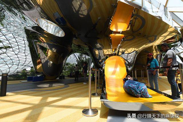 奇幻滑梯,就在星空花园旁边,是新加坡第一座大型多功能互动雕塑滑梯,是结合了艺术妙想和无穷乐趣的滑梯。其中一项是需要佩戴好装备,然后滑下去。刚好有老外游客在尝试,拍了几张,感觉装备很像一床被子和睡袋之类的。