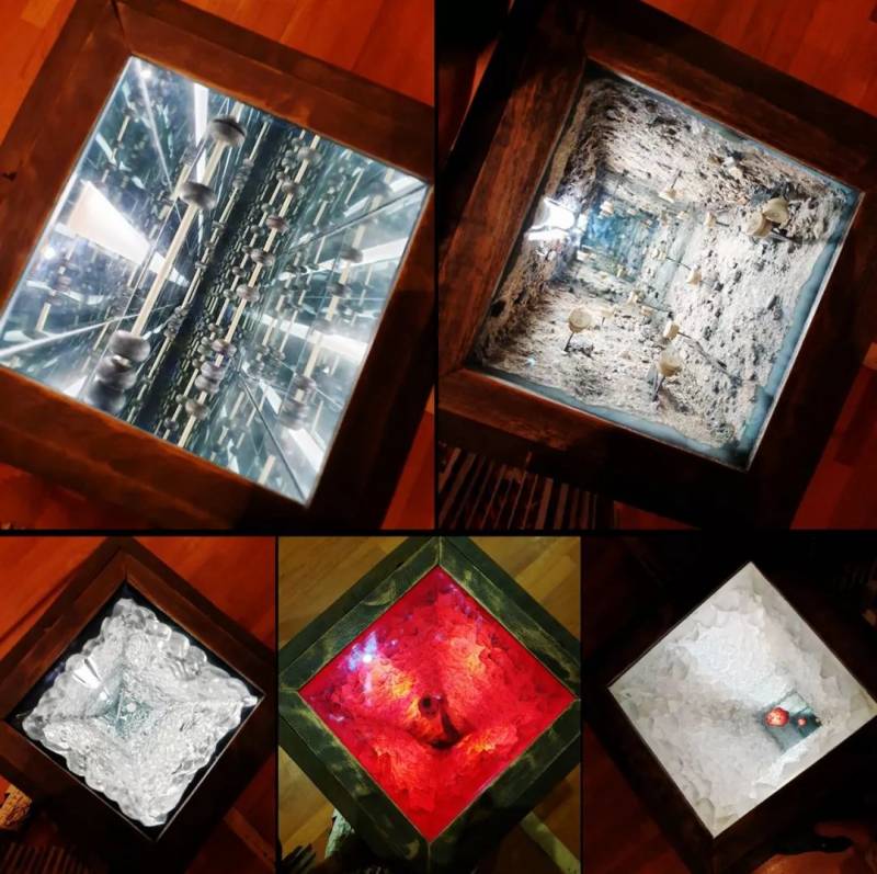触摸底部四种不同材质的按钮,会激活不同的灯光和音效,观察灯光在每一种材料上投射的影子,或者移动的方式,以及倾听不同的声音组合。