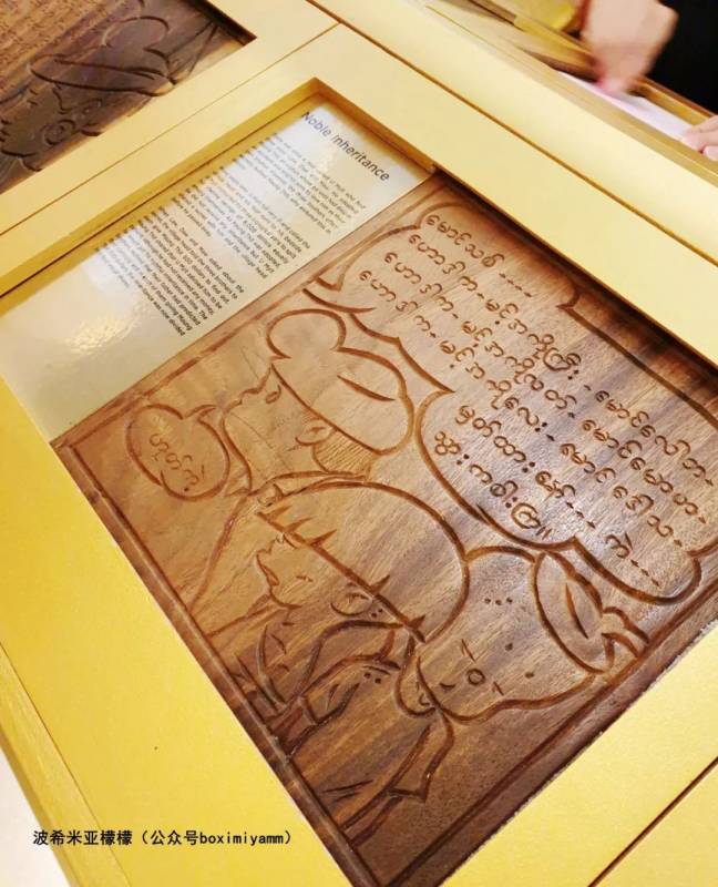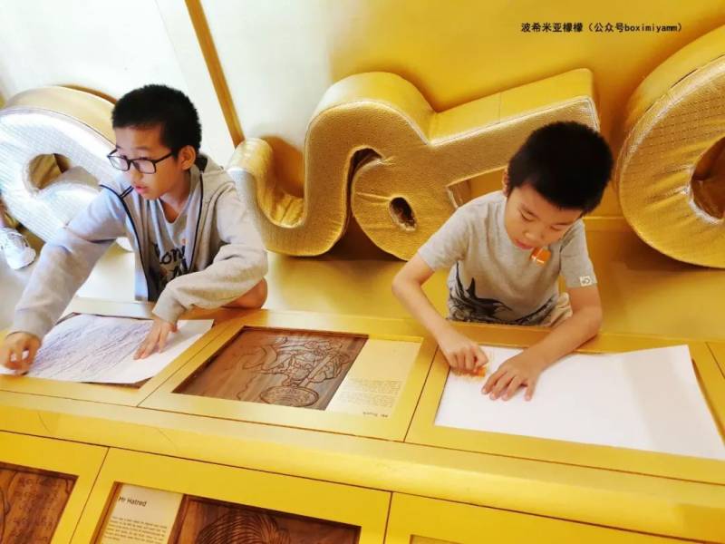 两间金色的房间里,布置了金色的靠垫,以及各种纸张、彩笔,一边听缅甸和罗马的故事,一边在木板上拓印古老的图画和文字。