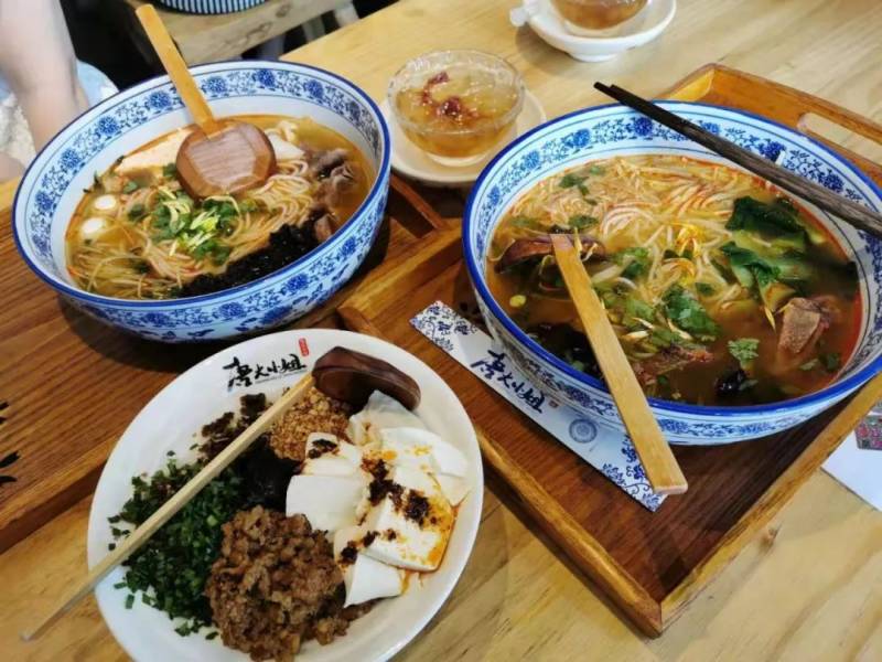 唐大小姐家主推的菊花米线,米线绵软,汤头浓郁温和,撒上菊花瓣点缀,吃完绝对不会让人菊花一紧。辣汤米线和酸菜米线刺激提神,豆花米线鲜美,都是不错的选择。