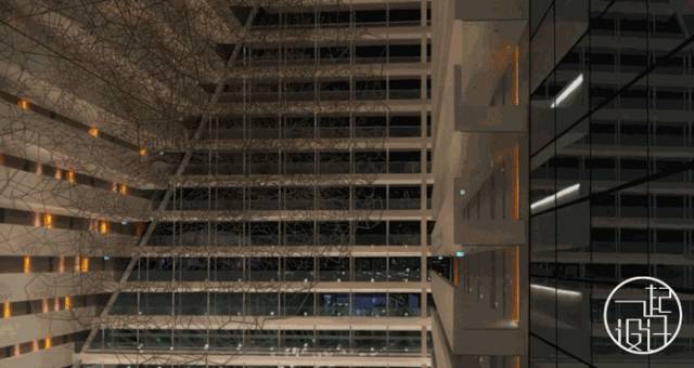 走进酒店内部,空间十分敞亮,气势宏伟的大厅,倾斜的墙体,阶梯式的阳台设计,中庭顶部的装饰,在电影中这些细节都有体现。