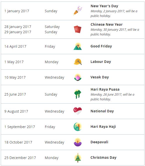 首先先来重温一下4月就已经公布了的新加坡2017年公共假期安排表: