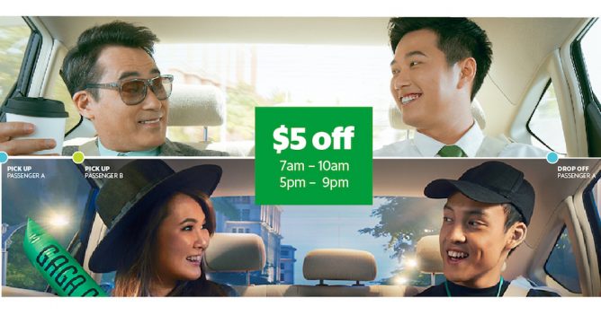 让你早上上班和晚上回家更省路费!GrabShare 本周7am-10am以及5pm-9pm这两个早晚高峰时间,叫车享受$5off!每天仅限20,000单!