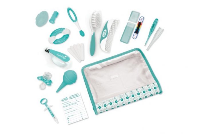 此款套装几乎包括了婴儿护理的全套必备品:注射型喂药器、指甲剪、数字体温计、额头温度计、梳子、梳头毛刷、吸鼻器、牙龈按摩器、指套牙刷、牙胶、奶嘴喂药器、钢玉砂指甲挫、外携带包包。