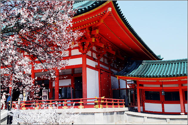 京都非常有名的赏樱胜地。平安神宫是公元1895年年为纪念日本古都平安迁都1100周年,根据前平安京朝堂院的建筑缩小重建,除外围冈崎疏水道的染井吉野樱外,平安神宫内的神苑亦种植很多枝垂樱,随风飘曳。谷崎润一郎在他的小说《细雪》中,所提到的红色枝垂樱,也正位于平安神宫之内。