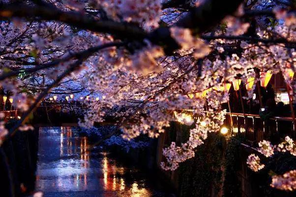 到夜间10pm,还能够欣赏夜樱,朦胧灯光倒映在水面,波光粼粼衬着樱花,景色绝美。