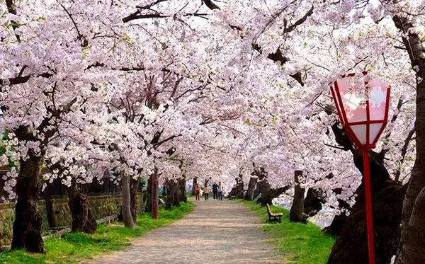 网上转发很火的一张河道铺满樱花的照片,就是青森的弘前公园外的护城运河。有近3000棵染井吉野樱、近1500棵里樱,甚至还有500棵左右的枝垂樱。当樱花花瓣纷纷扬扬地落在河面上,整条河流便成了一条粉色的花道。铺天盖地的粉色包围着赏樱的人们,真是无比浪漫与幸福的享受。