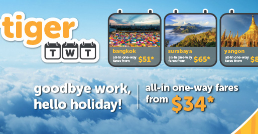 丢下工作,趁机逃离办公室和新加坡去度假吧!现在预订虎航周二、周三、周四飞往Penang, Phuket, Bangkok, Hong Kong等地的机票,最低$34起!