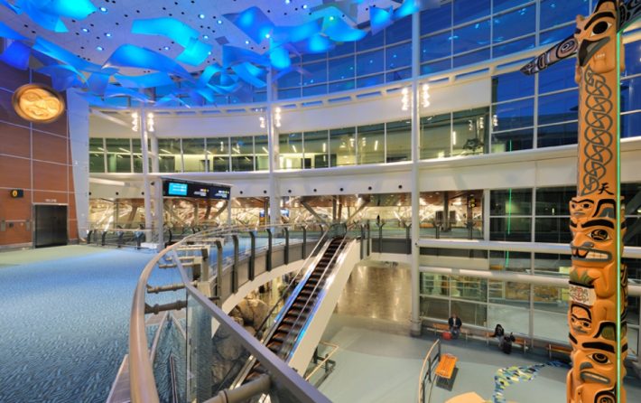 坐落在落基山脉脚下,温哥华国际机场与其说是一个机场,倒是更像一个自然博物馆。出发候机厅有一个114,000升水的水族馆,养着超过800种加拿大本土海洋生物。