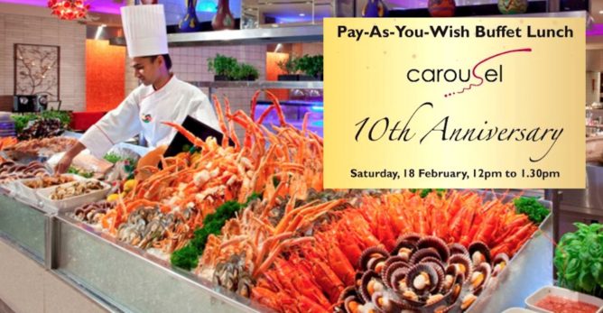 Carousel Buffet 十周年庆推出特别自助餐活动!Pay-As-You-Wish,没有定价,食客可以凭自己的喜好来决定最后付多少账单。最后所有的收入都会捐赠给The Straits Times School Pocket Money Fund (STSPMF)。