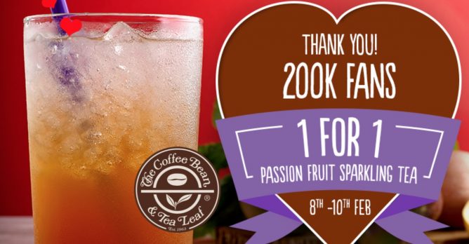 为了庆祝脸书粉丝破20万,The Coffee Bean & Tea Leaf 特别推出回馈活动~只要到店出示你是他们FB的粉丝,就能享受Passion Fruit Sparkling Tea 1 for 1的优惠!