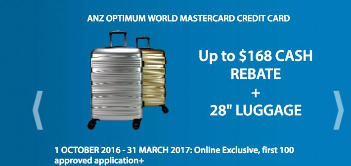 2016年10月至2017年3月31日期间,通过网络申请ANZ Optimum World Mastercard成功的前100名持卡人,还可获赠:28寸行李箱以及高达168新币的现金返现。