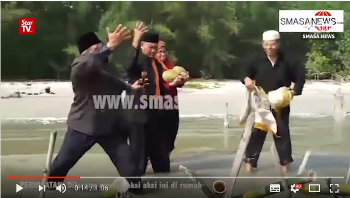 这次 Ibrahim Mat Zin和他的三个门徒执行仪式的地点是马来海边浅滩。作法工具在保留了两个椰子、两根木棍做成的“双筒望远镜”、一块地毯的基础上,还增加了五个马来西亚特色竹炮(bamboo ‘cannons’)和一碗海水。