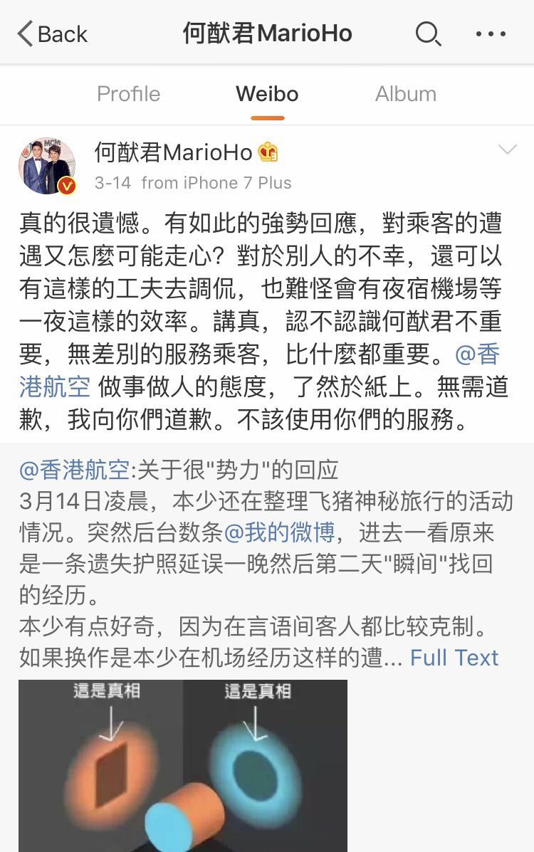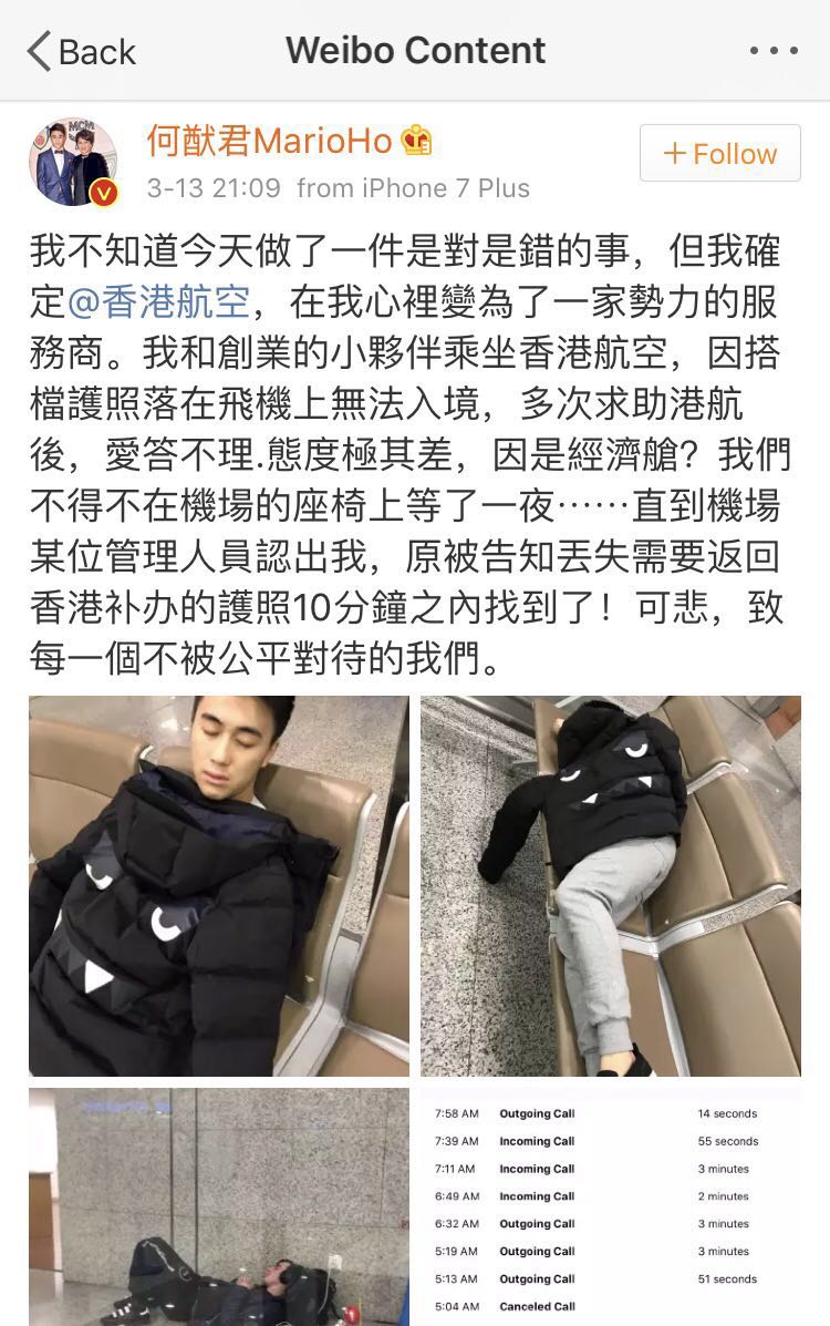 原来,这位超级富二代在和伙伴从香港飞上海时,伙伴因护照遗落在飞机上而被拒绝入境,求助机场及航空公司遭遇踢皮球,夜宿机场。但有人认出他的身份后却立即得到援助。这并没有什么好震惊的,生在天朝,就这点事,咱谁还没受过?真正让看惯纨绔富二代们吃惊的是,这位超级富二代,竟然坐经济舱!?  看看爱炫的某撕葱,那都是私人飞机走哪趟哪的好么~ 事后,航空公司方面做了紧急公关,没想到反倒更加让何猷君怼。