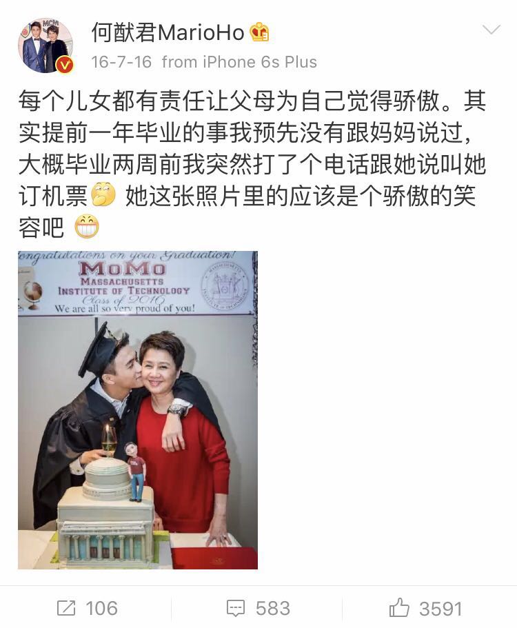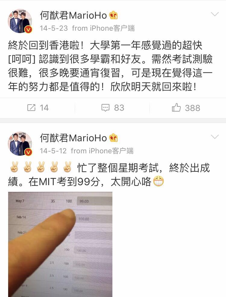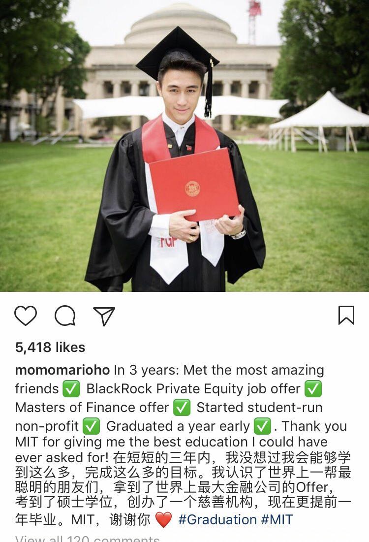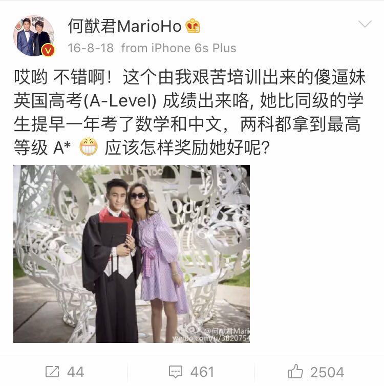 生于1995年的何猷君,22岁的人生仿佛开了挂!赌王有17个儿女,年龄跨度从 60 后到 90 后。何猷君是四房太太梁安琪所生的小儿子。虽然年纪不大,却是赌王四房孩子中最争气的一个,很受赌王喜欢。十一岁时参加“世界数学测试精英邀请赛”获奖,被赞数学天才,2013在英国名校Winchester College毕业后,先后获麻省理工(MIT)、剑桥两大学府取录!(外界曾传是牛津,但他本人曾在留言澄清,是剑桥)。 最后他听从赌王的意见,选择了MIT,并且提前一年毕业! 为了提前一年毕业,从小树立的学霸人设再次发光发亮.别人一年修四门课,他修八门!时常熬夜在图书馆啃书。 而学习成绩哪怕是在MIT,也一直名列前茅。 何猷君除了学习努力,工作也是极度认真,非常拼。结果他用两天干完了一星期的活,20 年来从未叫实习生下班回家的老板也被震惊了,因为没活可派只好让他回家。 本科毕业的时候,顺手就拿到了美国最牛投行的offer,但他放弃了,继续在MIT读Master,还玩转MIT的传统,黑了学校大楼的灯光系统,拿来玩俄罗斯方块! 不得不说,他自己爱学习也就算了,还附带把妹妹的学习成绩带动起来。 这位赌王最小的女儿,生于1999年的何超欣,上辈子可能也是拯救了整个银河系。于是完美成全了何猷君的炫妹狂魔人设,更是扬言哪怕日后结婚,最爱的人也是妹妹~ 这么努力上进,和赌王还有四太梁安琪的悉心教育是分不开的。 赌王对下一代的学习非常重视,他的儿女们均毕业于名校。而拼劲可以用恐怖来形容的何猷君,曾说母亲是他见过最勤奋的人,自己如果有她一半勤奋就一定会很成功。何猷君从小就视父母为榜样。 赌王生日,献上祝福。 哪怕创业,也是不拿家里一分钱。 创业初期,几个人挤在小小五平米的办公室。 除此之外,他也是丝毫没有富二代挥霍的习惯。为了省钱,家居自己拼,打扫自己做。 还能亲自下厨做个饭。 当然了,作为赌王之子,家产百亿,自然有钱的要命。何猷君生活中司空见惯的很多东西,是普通人望尘莫及的。不知道是不是出生自带逢赌必胜的体质,跟表哥随便打个赌,赌注就是一辆法拉利。 有钱有身份,比普通人也更容易接触到偶像。富少爷何猷君遇到周杰伦,秒变迷弟。 为了偶像学钢琴,玩转吉他。 当然还有陈医生。 和小贝夫妇称兄道弟。 这样的人生,很多人表示羡慕他在投胎的时候选择了简易模式。但每个人的人生起跑线都不一样,生长在这样一个富豪家庭,何猷君却仍然能比一般人更努力,这才是最值得热敬佩的事情。