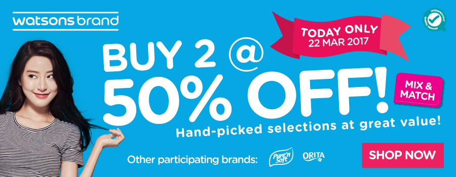 有什么想买的彩妆护肤或是日用品药品?3月22日屈臣氏 Watsons Brand, Orita and Pure’n Soft 指定产品2件50%off!相当于买一送一啦~花最少的钱享受最多的额外优惠!
