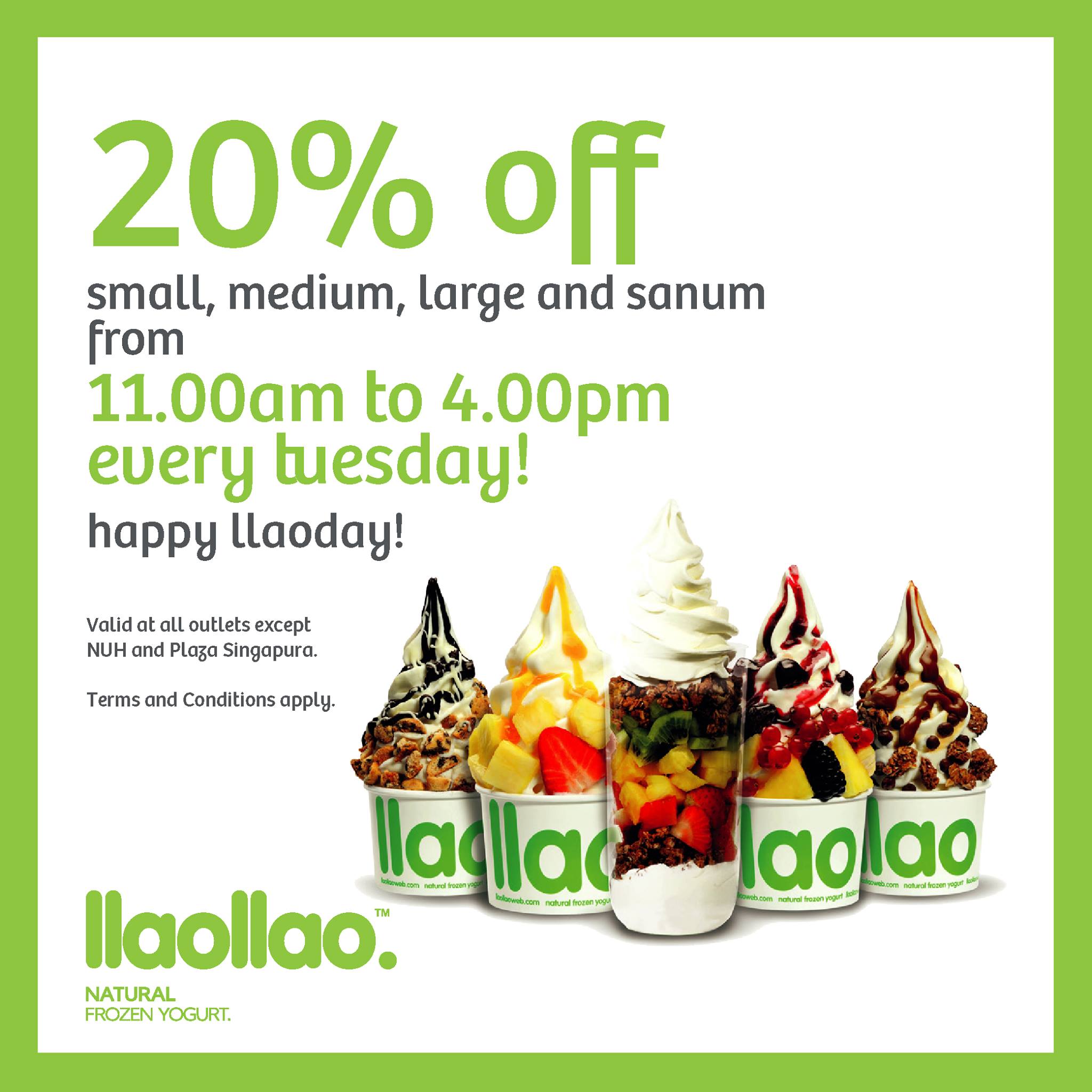上次 llaollao $1特别活动,因为没有UOB卡没享受到真是气煞人也?没关系!现在开始每周二11am-4pm,每个人都能享受任意size的冰淇淋20%off~ 我要一口气多买几个!