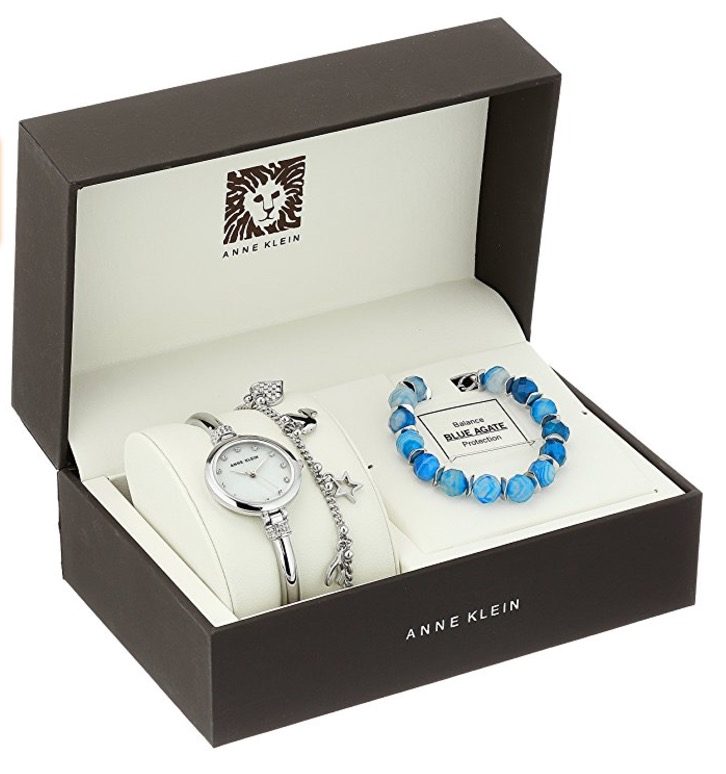 Anne Klein 除了超级美貌的手表之外,包包也相当不错。Anne Klein 施华洛世奇水晶珍珠母贝日本石英腕表套装,珍珠母贝表盘搭配蓝色玛瑙串珠链,精巧别致。Anne Klein 黑色蛇纹皮小挎包也是很百搭的设计。