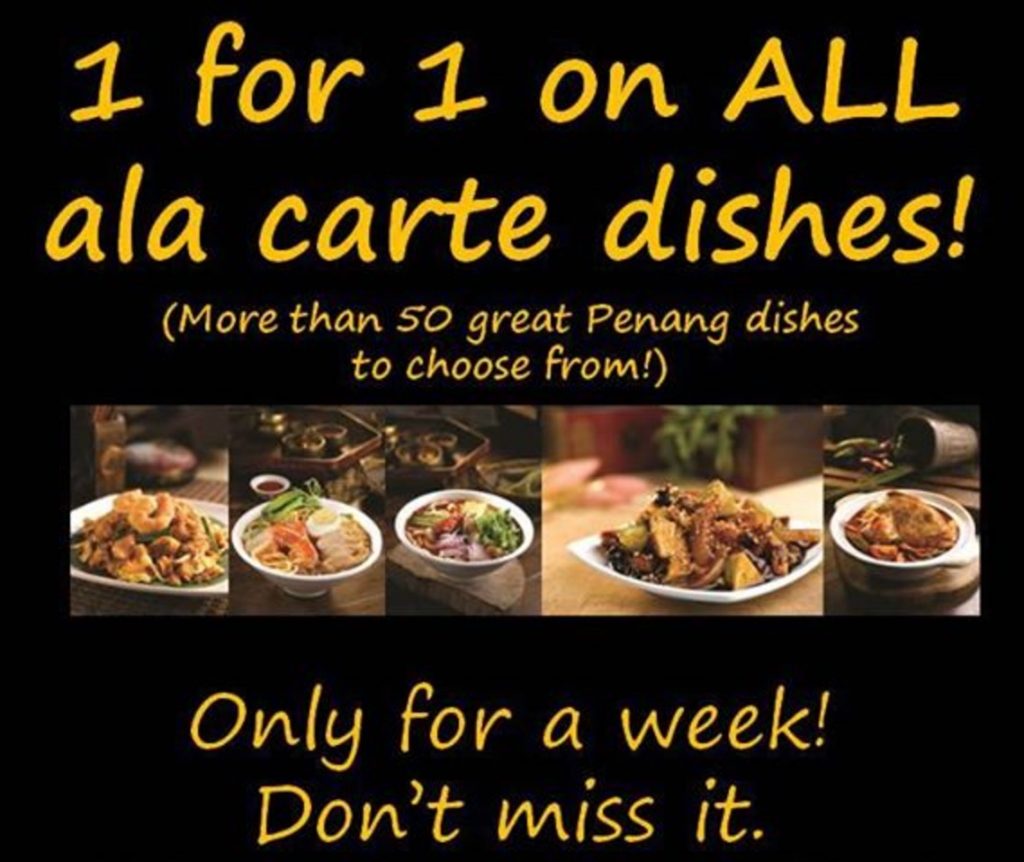 简直令吃货难以置信,Penang Culture @Causeway Point现在所有菜单上的菜品,都能享受1 for 1的特别活动!对嗒我们都没有看错,是所有菜品~还有什么比这更让吃货们兴奋的~呼朋引伴去大吃一顿吧!