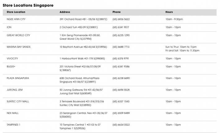 - 然而真爱粉们一定已经发现了,官网很多热销单品都是显示缺货状态的。这时候不妨去实体店溜达一圈,往往会有少量存货惊喜。皇后给大家拉一个实体店的清单,新加坡一共11家: