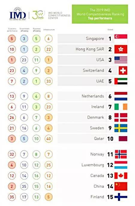 瑞士洛桑国际管理发展学院今日发布《2019世界竞争力报告》,报告显示,新加坡自2010年以来首次跃升为全球最具竞争力经济体,美国则从榜首滑落,而经济不稳定影响了欧洲排名情况。中国排名较去年下滑一位,位居第14位。全球竞争力排名前十的国家和地区为新加坡、香港、美国、瑞士、阿联、荷兰、爱尔兰、丹麦、瑞典和卡达。