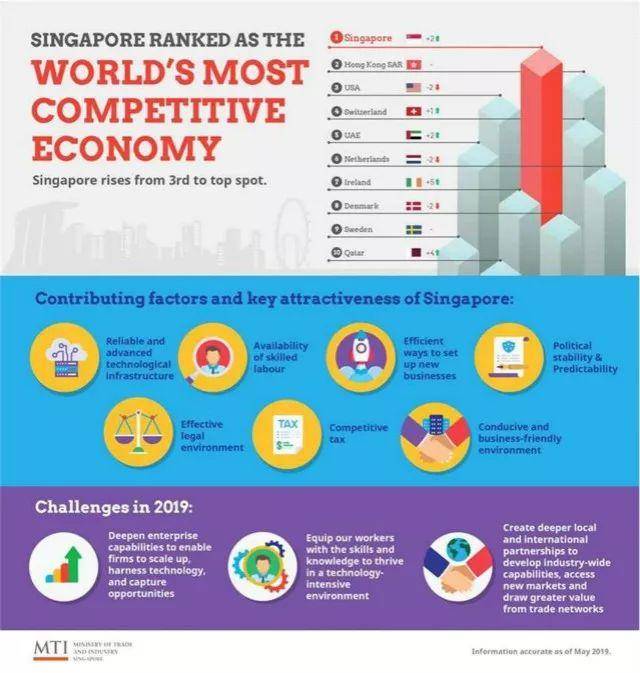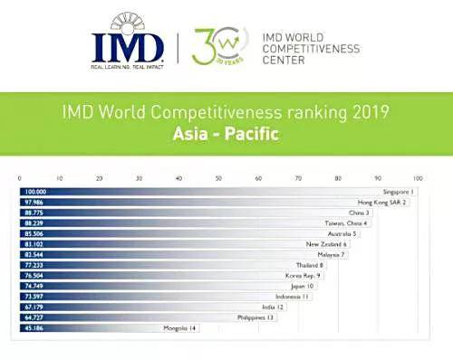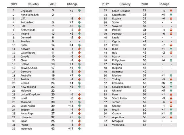 IMD认为,新加坡的崛起是由于其先进的技术基础设施、熟练的劳动力、有利的移民法以及建立新业务的有效方式。由于香港良好的税收和商业政策环境以及商业融资渠道,香港特别行政区连续两年位居榜单第二位。